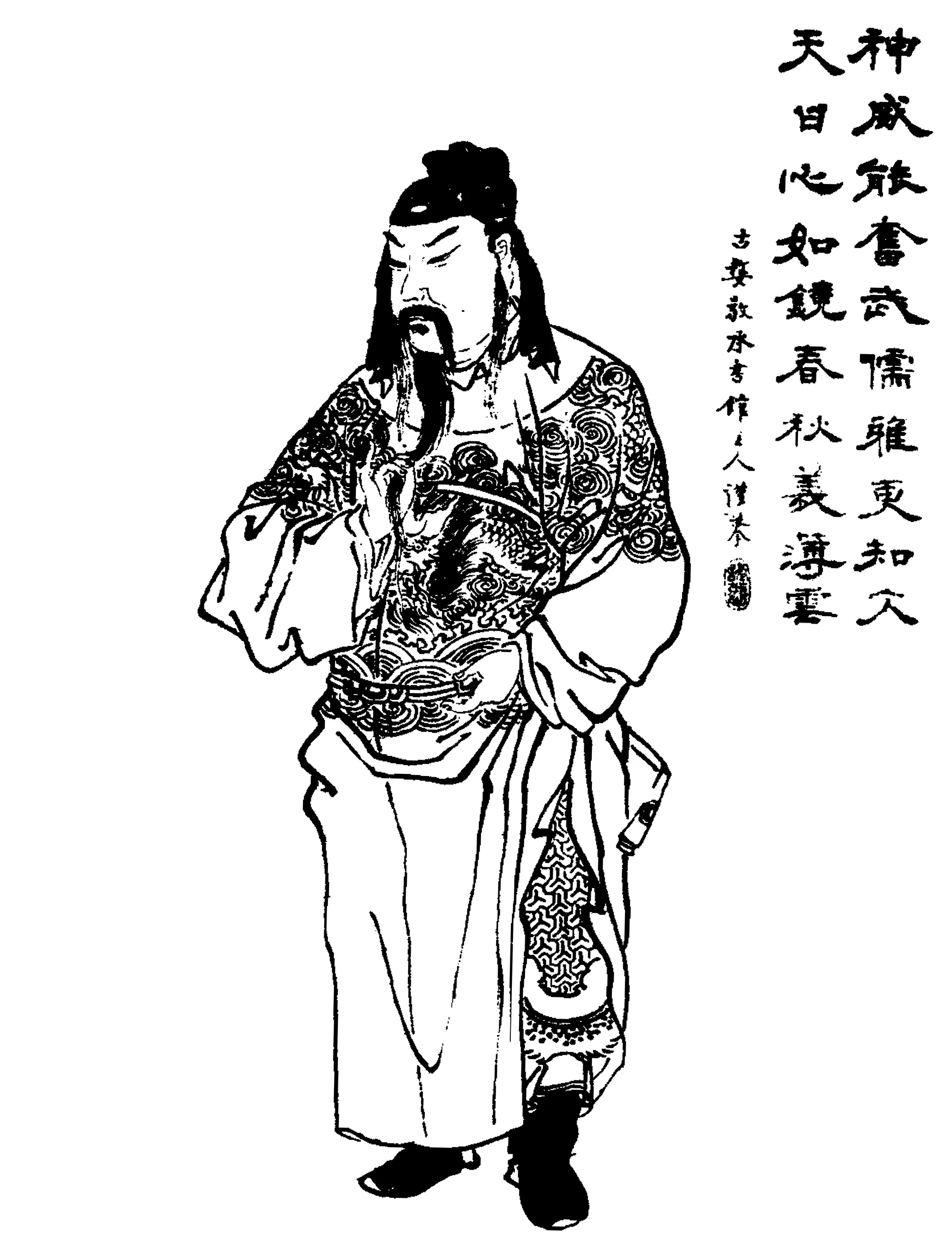 The rise of the fortunes of Han began when Liu Bang the Supreme Ancestor[4] slew a white serpent to raise the banners of uprising, which only ended when the whole empire belonged to Han (BC 202). This magnificent heritage was handed down in successive Han emperors for two hundred years, till the rebellion of Wang Mang caused a disruption.[5] But soon Liu Xiu the Latter Han Founder restored the empire,[6] and Han emperors continued their rule for another two hundred years till the days of Emperor Xian, which were doomed to see the beginning of the empire's division into three parts, known to history as The Three Kingdoms. But the descent into misrule hastened in the reigns of the two predecessors of Emperor Xian---Emperors Huan and Ling---who sat in the Dragon Throne about the middle of the second century. Emperor Huan paid no heed to the good people of his court, but gave his confidence to the Palace eunuchs.[7] He lived and died, leaving the scepter to Emperor Ling, whose advisers were Regent Marshal Dou Wu and Imperial Guardian Chen Fan.[8] Dou Wu and Chen Fan, disgusted with the abuses of the eunuchs in the affairs of the state, plotted the destruction for the power-abusing eunuchs. But Chief Eunuch Cao Jie was not to be disposed of easily. The plot leaked out, and the honest Dou Wu and Chen Fan were put to death, leaving the eunuchs stronger than before. It fell upon the day of full moon of the fourth month, the second year, in the era of Established Calm (AD 168), that Emperor Ling went in state to the Hall of Virtue. As he drew near the throne, a rushing whirlwind arose in the corner of the hall and, lo! from the roof beams floated down a monstrous black serpent that coiled itself up on the very seat of majesty. The Emperor fell in a swoon. Those nearest him hastily raised and bore him to his palace, while the courtiers scattered and fled. The serpent disappeared. But there followed a terrific tempest, thunder, hail, and torrents of rain, lasting till midnight and working havoc on all sides. Two years later the earth quaked in Capital Luoyang, while along the coast a huge tidal wave rushed in which, in its recoil, swept away all the dwellers by the sea. Another evil omen was recorded ten years later, when the reign title was changed to Radiant Harmony (AD 178): Certain hens suddenly crowed. At the new moon of the sixth month, a long wreath of murky cloud wound its way into the Hall of Virtue, while in the following month a rainbow was seen in the Dragon Chamber. Away from the capital, a part of the Yuan Mountains collapsed, leaving a mighty rift in the flank. Such were some of various omens. Emperor Ling, greatly moved by these signs of the displeasure of Heaven, issued an edict asking his ministers for an explanation of the calamities and marvels. Court Counselor Cai Yong replied bluntly: "Falling rainbows and changes of fowls' sexes are brought about by the interference of empresses and eunuchs in state affairs." The Emperor read this memorial with deep sighs, and Chief Eunuch Cao Jie, from his place behind the throne, anxiously noted these signs of grief. An opportunity offering, Cao Jie informed his fellows, and a charge was trumped up against Cai Yong, who was driven from the court and forced to retire to his country house. With this victory the eunuchs grew bolder. Ten of them, rivals in wickedness and associates in evil deeds, formed a powerful party known as the Ten Regular Attendants---Zhang Rang, Zhao Zhong, Cheng Kuang, Duan Gui, Feng Xu, Guo Sheng, Hou Lan, Jian Shuo, Cao Jie, and Xia Yun.[9] One of them, Zhang Rang, won such influence that he became the Emperor's most honored and trusted adviser. The Emperor even called him "Foster Father". So the corrupt state administration went quickly from bad to worse, till the country was ripe for rebellion and buzzed with brigandage. At this time in the county of Julu was a certain Zhang family, of whom three brothers bore the name of Zhang Jue, Zhang Bao,[10] and Zhang Liang, respectively. The eldest Zhang Jue was an unclassed graduate, who devoted himself to medicine. One day, while culling simples in the woods, Zhang Jue met a venerable old gentleman with very bright, emerald eyes and fresh complexion, who walked with an oak-wood staff. The old man beckoned Zhang Jue into a cave and there gave him three volumes of The Book of Heaven.[11] "This book," said the old gentleman, "is the Essential Arts of Peace. With the aid of these volumes, you can convert the world and rescue humankind. But you must be single-minded, or, rest assured, you will greatly suffer." With a humble obeisance, Zhang Jue took the book and asked the name of his benefactor. "I am Saint Hermit of the Southern Land," was the reply, as the old gentleman disappeared in thin air. Zhang Jue studied the wonderful book eagerly and strove day and night to reduce its precepts to practice. Before long, he could summon the winds and command the rain, and he became known as the Mystic of the Way of Peace. In the first month of the first year of Central Stability (AD 184), there was a terrible pestilence that ran throughout the land, whereupon Zhang Jue distributed charmed remedies to the afflicted. The godly medicines brought big successes, and soon he gained the title of the Wise and Worthy Master. He began to have a following of disciples whom he initiated into the mysteries and sent abroad throughout all the land. They, like their master, could write charms and recite formulas, and their fame increased his following. Zhang Jue began to organize his disciples. He established thirty-six circuits, the larger with ten thousand or more members, the smaller with about half that number. Each circuit had its chief who took the military title of General. They talked wildly of the death of the blue heaven and the setting up of the golden one; they said a new cycle was beginning and would bring universal good fortune to all members; and they persuaded people to chalk the symbol